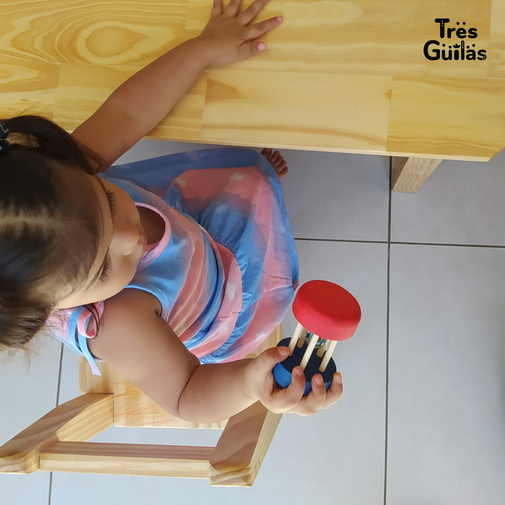 • Exploración del mundo con la mano y lengua: el Sonajero de madera de Tres Güilas tiene texturas, estas texturas permiten al niño empezar su descubrimiento del mundo con las manos y lengua. Dejalo explorar con sus sentidos y abrir su mente a las sensaciones, sabores y texturas.